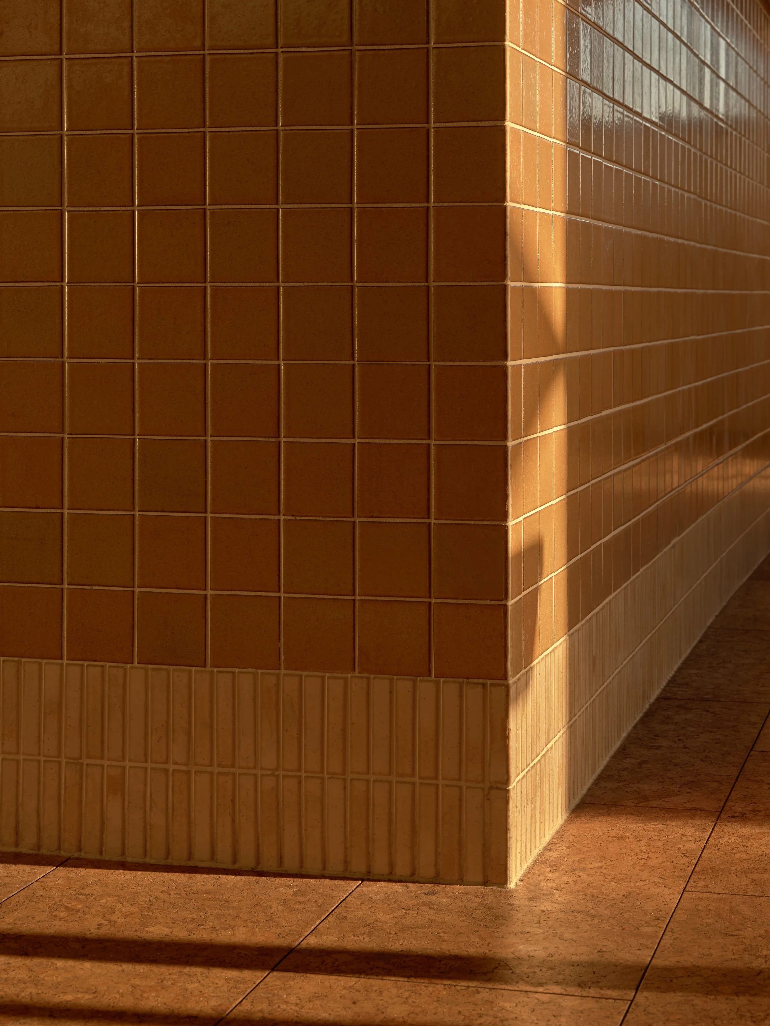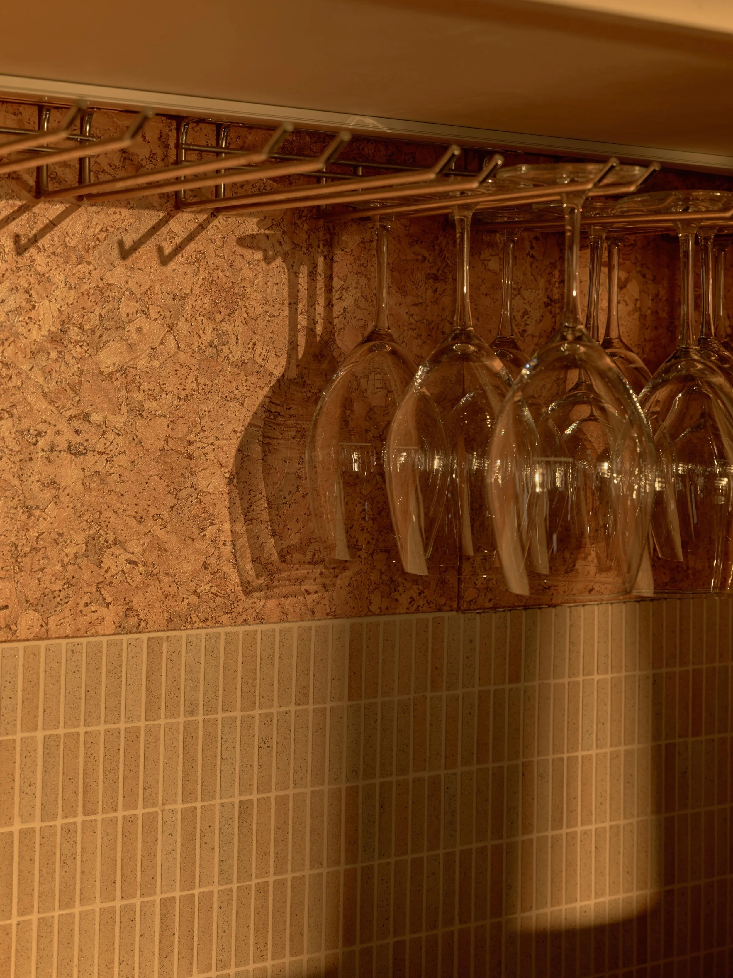 Natural textures and a rich, grounded palette shape the interior. A deep burgundy ceiling drenching the exposed beams envelop the room in warmth and depth, balanced by cork flooring, expressive timber grain, and crafted tiled details that bring texture and character throughout the space.